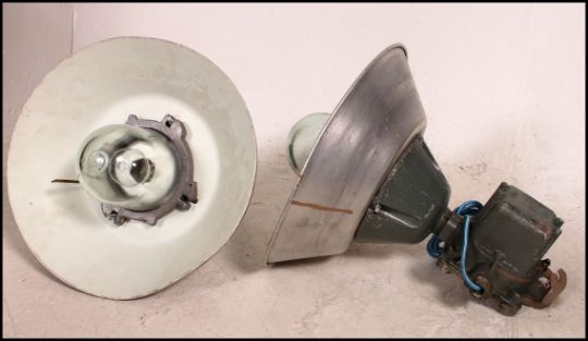 A pair of mid century Industrial factory pendant shades of continental original marked for Tylko De Stref. Each metal shade with the stunning original heavy set bracket fitments above.