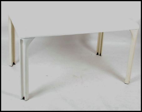 A 1970's retro Italian dining table in white by Vico Magistretti. The rectangular table raised on angular legs with white original finish. 72cm high x 124cm wide x 80cm deep