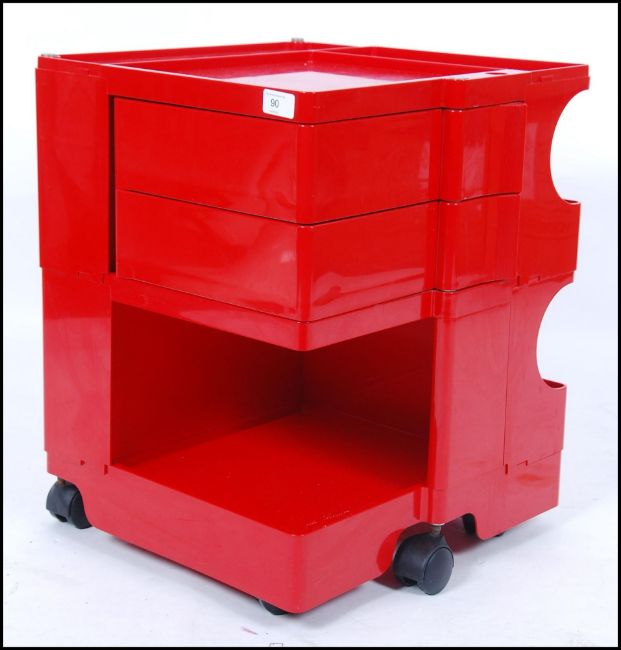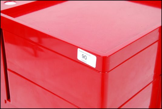 A retro 1970's Joe Columbo Boby trolley in red standing on castors and having twist out drawers, storage shelves to back and front and smaller pockets to top etc. Measures 53cms x 42cms x 42cms