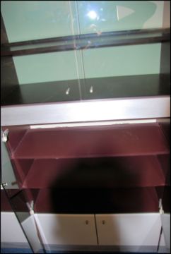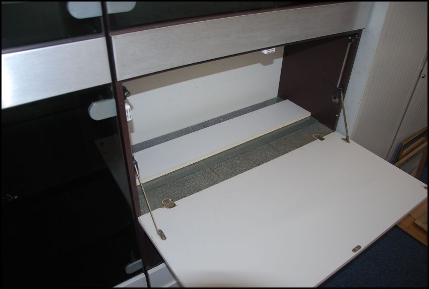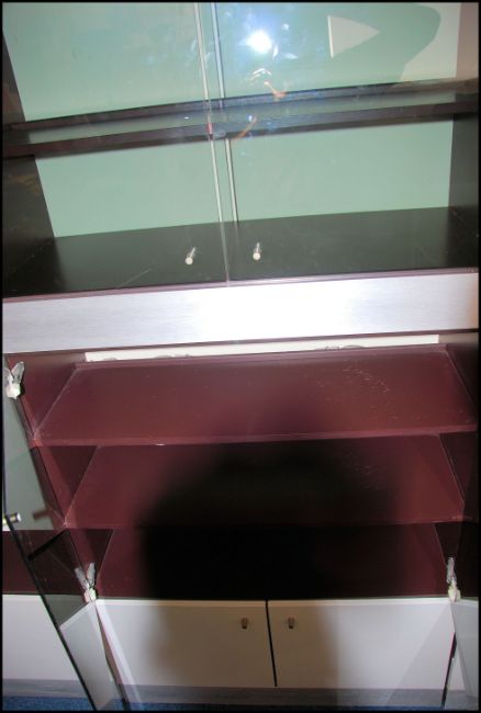 A 1970's Modular Hulsta retro modular upright 4 section cabinet system withs smoked glass, white facia and polished steel bodies. Comprising glass cabinets over fall front lockers and cupboards, the unit comprising 4 sections. 180cms x 324cms long x 40cms depth