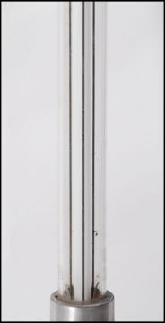 A large Industrial explosion proof floor standing - wall fit tube strip light by Simplex dating to the 1950's. The large glass cylinder shade housing tube light having a stunning large polished aluminium box mounted base. Originally from the British cellophane factory being rewired. Measures(cm) Height 189.