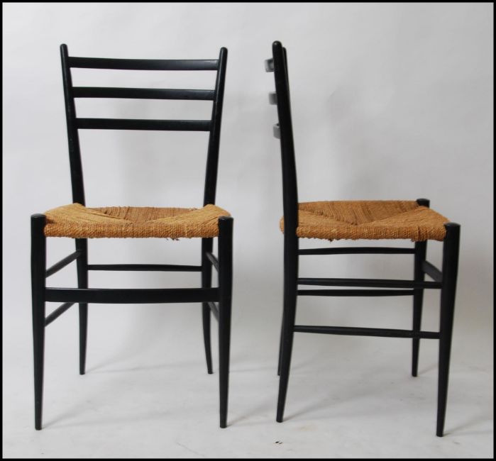 A set of 6 mid century ebonised and rattan weave dining chairs in the manner of Gio Ponti. The chairs with rattan weave seats having pointed and tapering railed back rests. 83cm high x 43cm wide x 40cm deep