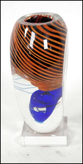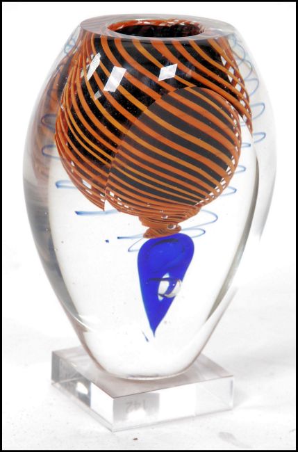 A 1970's Italian studio art glass vase having inset control bubble and helix - spiral swirl decoration. Unsigned and raised on glass square plinth