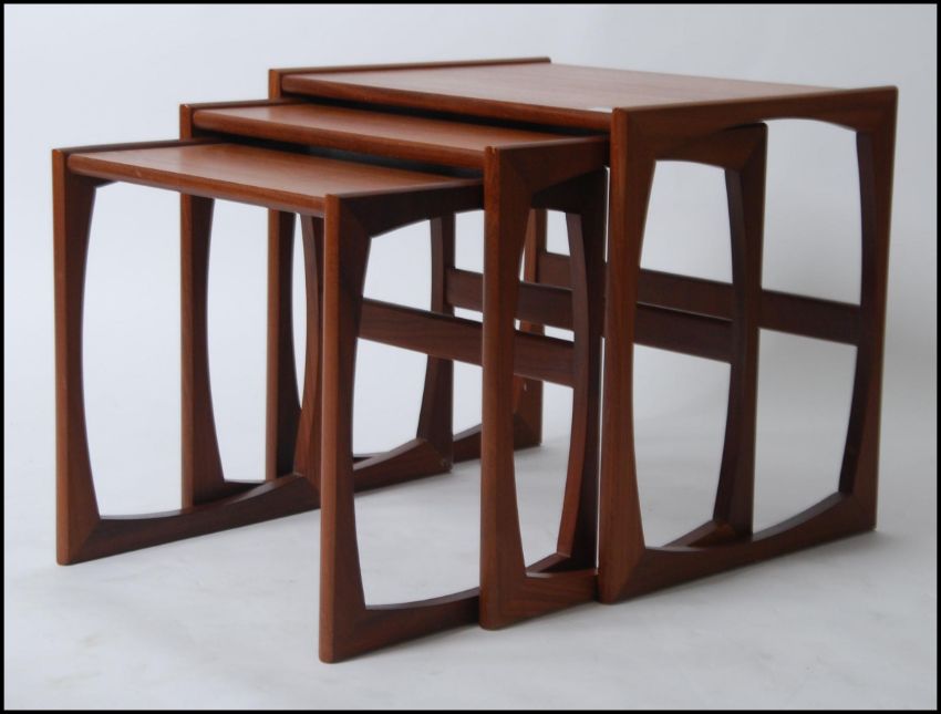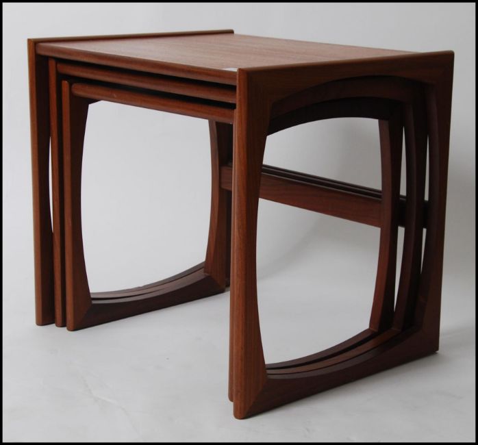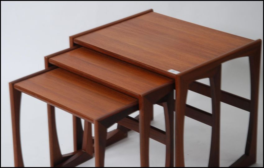 A 1970's G-Plan Kelso pattern retro teak wood nest of tables raised on shaped supports with graduating tops above H49 W53 D43cm