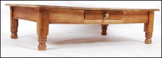 A Victorian pine low and wide coffee table being raised on turned legs with planked top ( converted from a dining table ) Measures 34cms x 128cms x 83cms