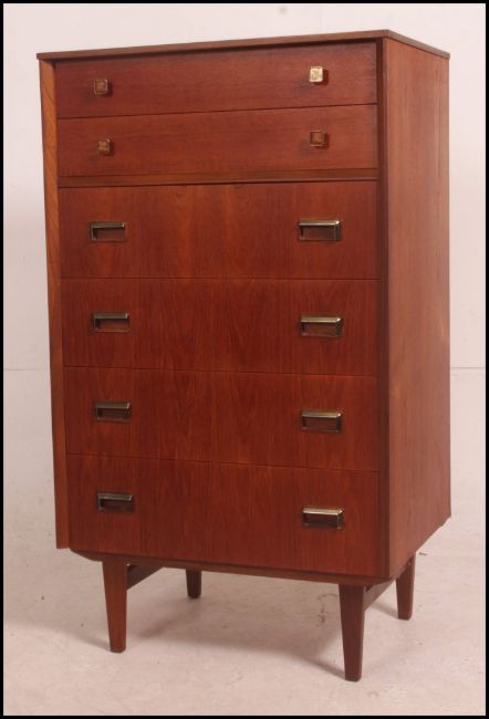 A 1970's retro Danish influence teak chest of drawers raised on suspension set lets with inset top drawers over further bank of drawers beneath 114cm high x 66cm wide x 46cm deep.