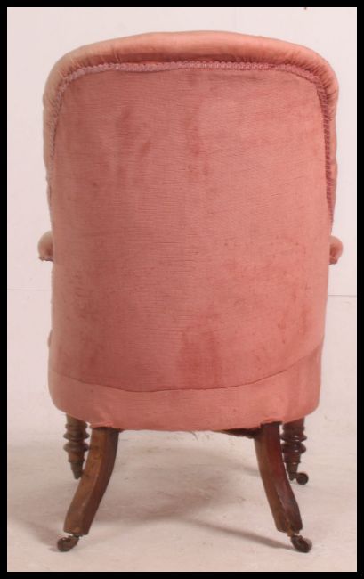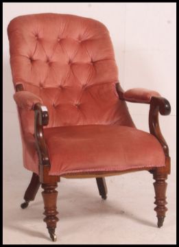 A Victorian mahogany armchair being raised on turned legs with ceramic castors having upholstered seat with scrolled elbow rests. 98cm high x 64cm wide x 73cm deep