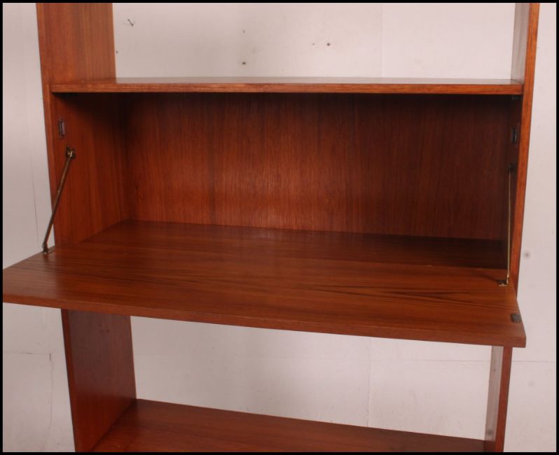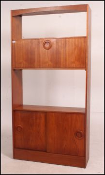 A vintage mid century teak sideboard / cabinet with open shelving , drop down drinks cabinet to top and twin sliding doors to base cupboard with lovely large oval teak handle detail . 180cm high x 91cm wide x 30cm deep.