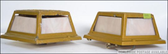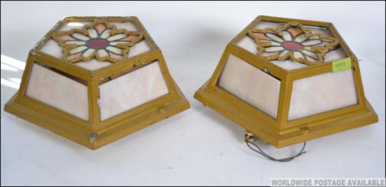 A set of 5 20th century unusual stained glass and cast metal wall lights in the manner of Tiffany ( 2 showing - all five identical ) Measure: 33cms wide.