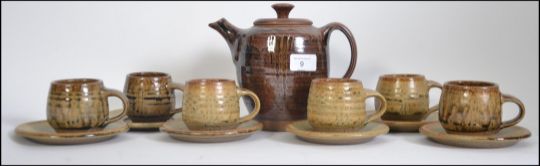A Roger Cockram stoneware 6 person tea service to include 6 cups and saucers and a teapot. Each piece stamped to base RC and is slightly different.