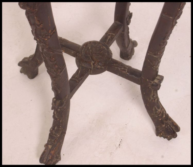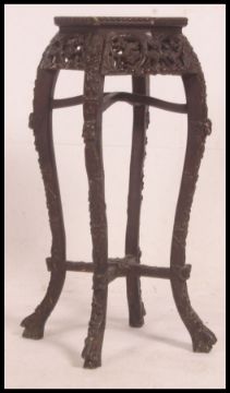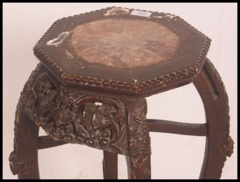 A 19th century Chinese carved hardwood plant stand - jardiniere with circular inset rouge marble, floral and leaf carving to base, four cabriole supports. 78cm high x 42cm wide x 42cm deep