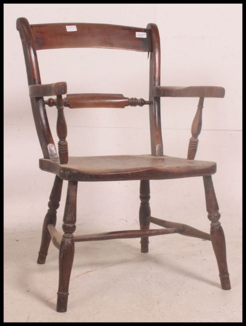 A Victorian beech and elm Oxford Windsor back back armchair having saddle seat and raised on turned legs united by stretchers. 84cm high x 55cm wide x 55cm deep
