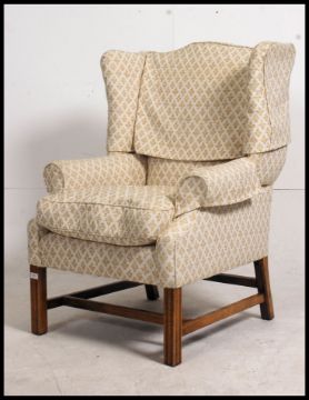 A mid century Georgian revival Chesterfield armchair raised on squared legs united by stretchers having modern upholstered frame. 106cm high x 75cm wide x 70cm deep