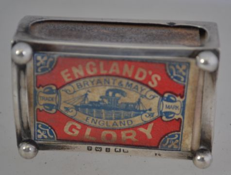A silver hallmarked match box holder, having a central cartouche monogram, raised on bun feet, Birmingham assay marks and dating to 1903 W6cm 25g