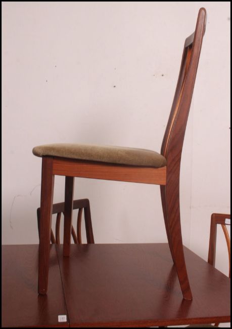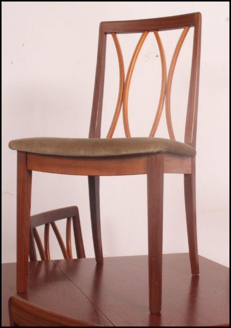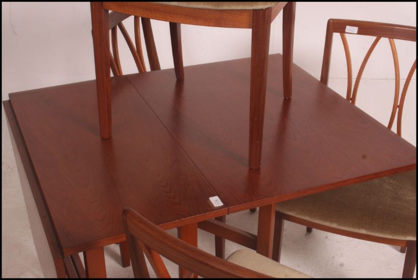 A set of four 1970's G-Plan teak lattice back retro dining chairs raised on tapered legs with overstuffed padded seats along with a G Plan drop leaf teak wood table . 73cm high x 81cm wide x 42cm deep.