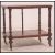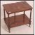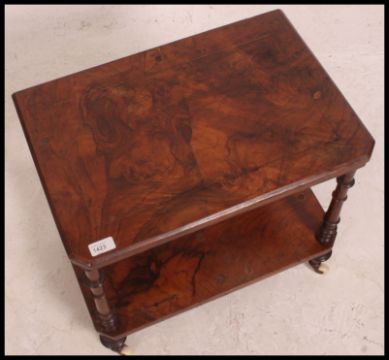 A Victorian walnut side table raised on turned column supports with white ceramic castors. Each tier with marquetry inlaid details. 50cm high x 54cm wide x 57cm deep