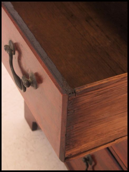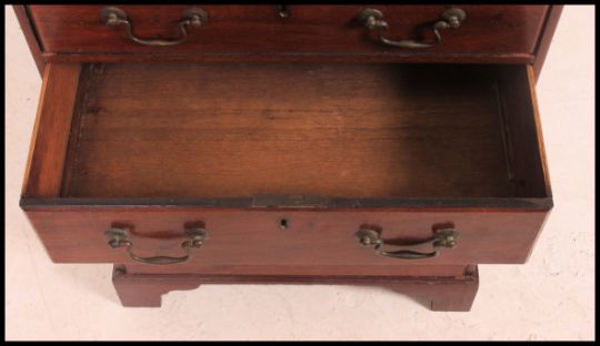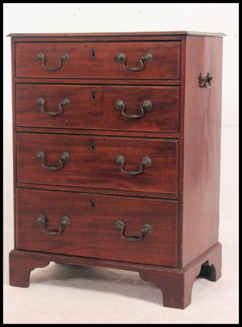 A Georgian bachelors mahogany chest of drawers of small proportions. The chest with side handles having a bank of drawers being raised on bracket feet. The drawers with brass swan neck handles. Oak lined drawers to interior. Measures: 77cm high x 58cm wide x 36cm deep