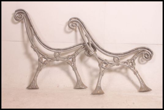 A pair of cast metal bench ends dating from the 20th century in the coalbrookdale style. 77cm high x 77cm wide