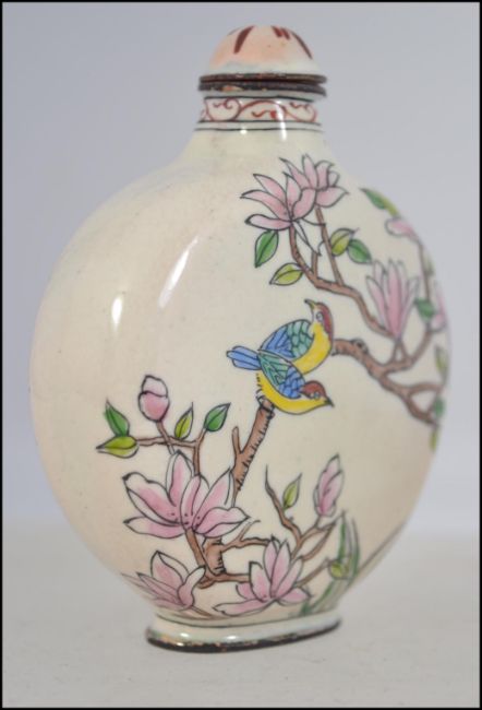 A Chinese enamel on brass perfume bottle depicting song birds and floral scenes H8cm
