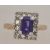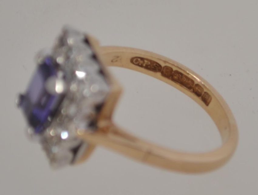 A 9ct gold and amethyst glass stone ladies dress ring, the central amethyst surrounded by clear cz stones. Size j.5 / Weight 3.6g