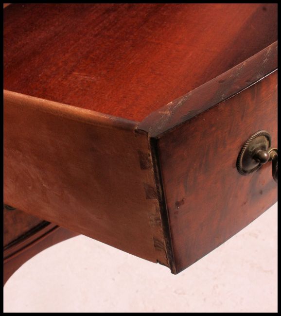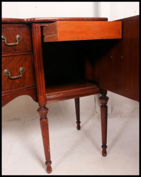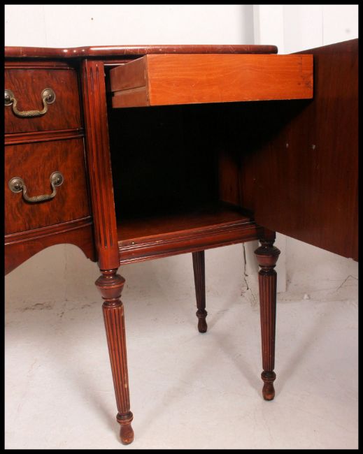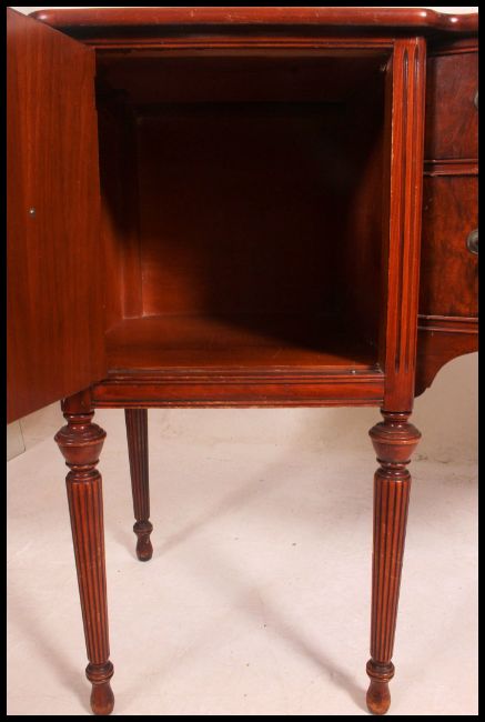 A Federal revival mahogany sideboard of bow fronted form being raised on turned legs with flame mahogany cupboards and drawers to the wide body above. 92cm high x 167cm wide x 58cm deep