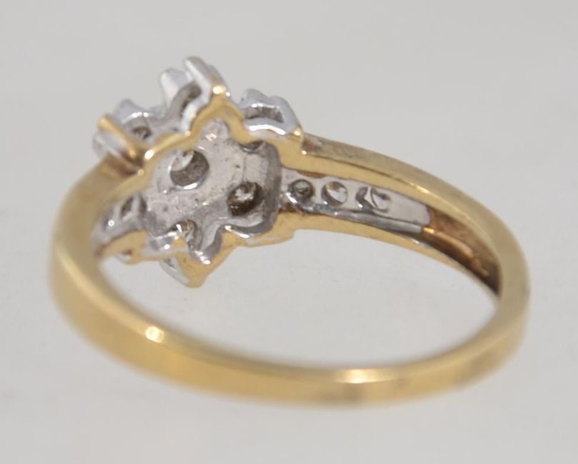 A 9ct gold and diamond ring with central diamond cluster and channel set diamond shoulders. Total diamonds approx 47pts. Marked 0.47. CCM Mark. Hallmarked assay office mark rubbed possibly for London. Size L. Weight 2.3g.