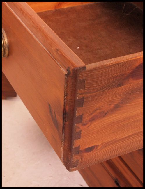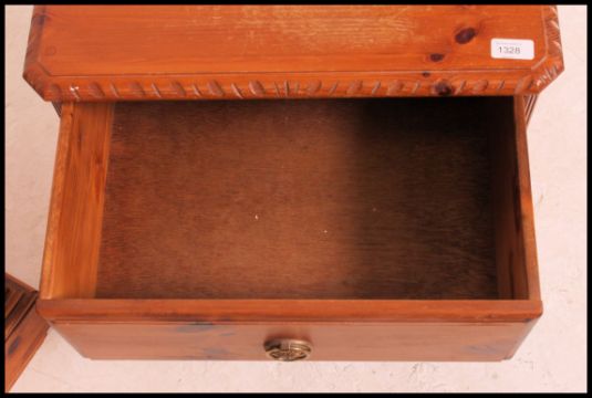 A pair of antique style pine bedside drawers each having two drawers with drop down brass handles raised on a plinth base. Measures: 53cm high x 51cm wide x 46cm deep
