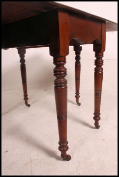 A Victorian 19th century solid mahogany drop leaf pembroke dining table being raised on turned legs, the leaves being supported on fly supports. 75cm high x 138cm wide x 91cm deep