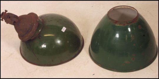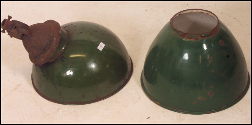 A pair of vintage enamel two tone green and enamel painted factory Industrial pendant lights. 30cm high x 46cm wide x 46cm deep.