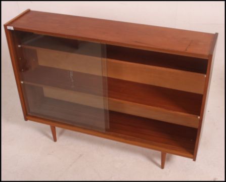A vintage 1970's Danish Influence teak mid century bookcase / shelving unit with glass sliding doors raised on tapering legs . 80cm high x 107cm wide x 24cm deep.