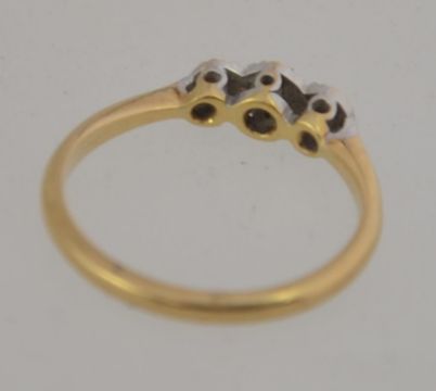 An 18ct gold and platinum diamond ring set with a central diamond with illusion platinum stones either side. Marked 18ct and Plat, tests 18ct and platinum. Weight 2g. Size J.5