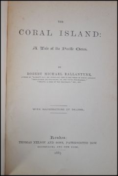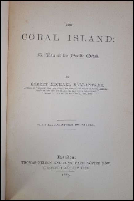 The Coral Island by RM Ballantyne. Pub Nelson & Sons, London 1885. Pictorial cloth hardback. With gilt decorated titles and pictorial to front.