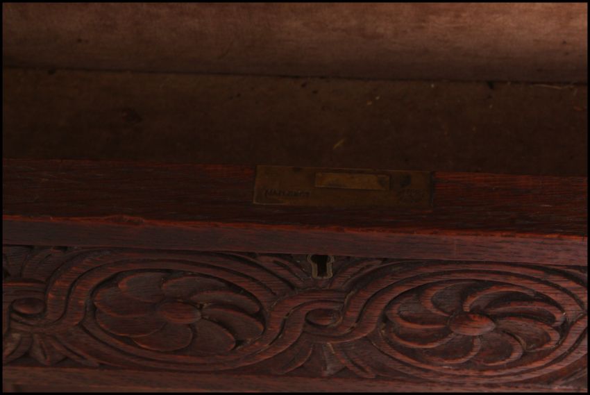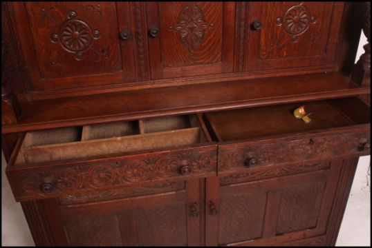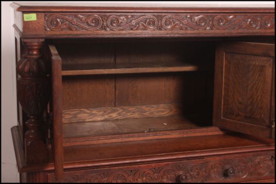 A Victorian Maple & Co carved oak court cupboard sideboard. The solid oak cupboard with twin doors under 2 short drawers with gallery upright top having cabinet flanked by carved columns. Black maple and co label to the drawer