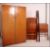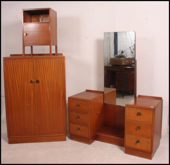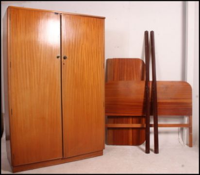 A 1950's walnut bedroom suite comprising a tallboy cabinet, double wardrobe, double bed and a bedside cabinet