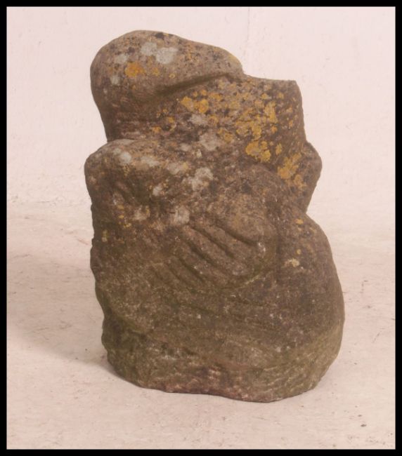 A well weathered late 19th early 20th century carved stone Eagle ( Bath stone ? ) the Eagle being enveloped with his wings raised on a circular base. 40cm high x 32cm wide x 22cm deep