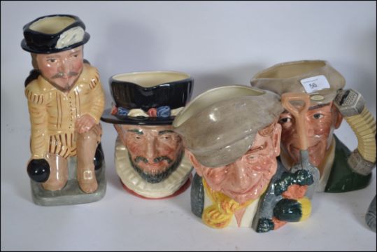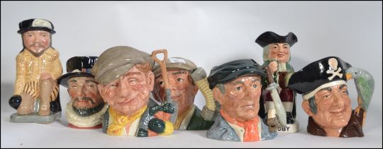 A collection a large size Doulton character mugs LITTLE MESSER D-6819 , THE GARDENER D-6630 , LONG JOHN SILVER D-6335 , BEEFEATER - 847680 , THE BUSKER D-6775 , SIR FRANCES DRAKE D-6660 , TOBY ALE - 8074 , plus one mid sized LONG JOHN SILVER (Staffordshire) Tallest H21cm