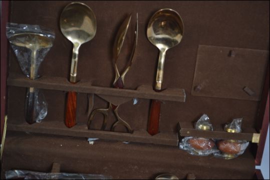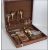 A cased canteen of cutlery containing a bronze and wooden studded handles, service for six people W43cm