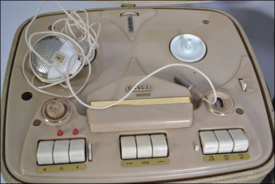 A vintage Grundig portable reel to reel tape player along with a vintage Cossar reel to reel portable tape player