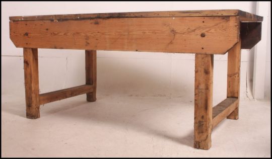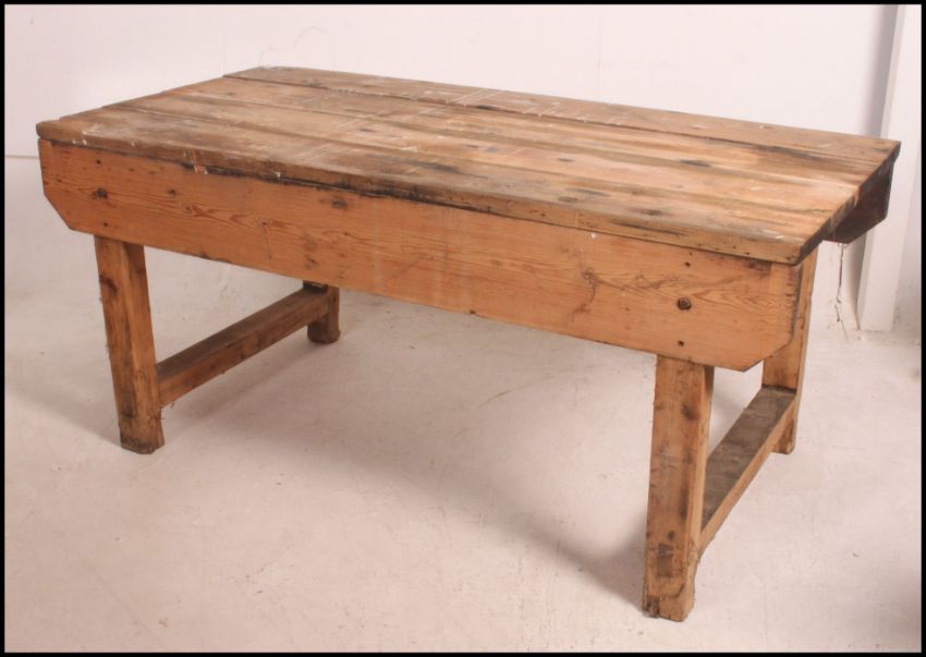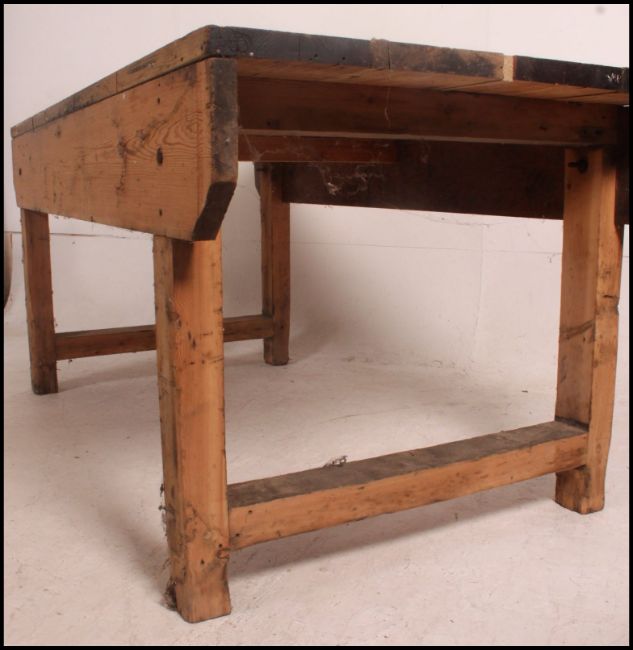 A large mid 20th century Industrial type scratch built pine four plank workbench / table having chunky square supports united by stretchers