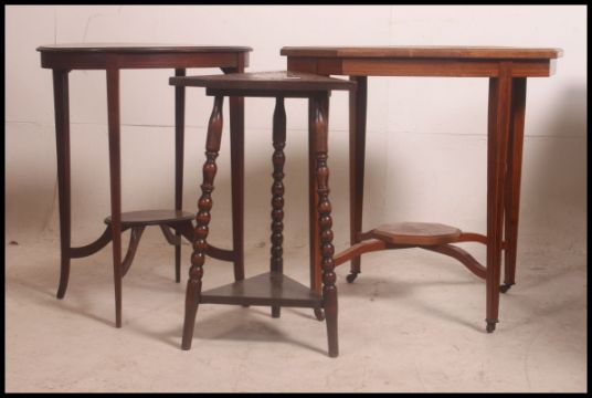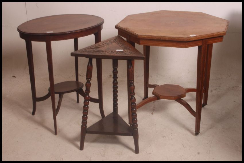 An Edwardian oak marquetry inlaid centre table together with an Edwardian mahogany inlaid lamp table and an oak triangular occasional table