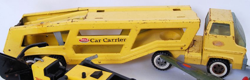 A collection of assorted vintage Tonka tin toy vehicles, to include transporter lorry and various other small Tonka toys. Along with a vintage Keilkraft engine powered plastic Spitfire plane.