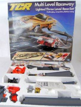An original vintage TCR racing set ' Multi Level Racing ' ' Lighted Three Level Set ' within the original box. With extra cars. Original box, unchecked for completeness.