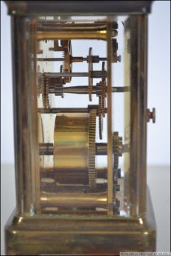 A late 19th century French made carriage clock with Selfridges London retailers mark of inverted rectangular form with a circular roman numeric dial and baton pointers on squat supports in leather case with key. Measures 13cm high.