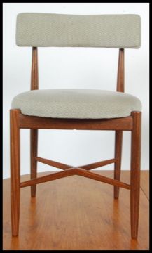 A mid-20th century G-Plan teak D-end pull out extending dining table with a single additional fold away leaf, raised on four simple turned tapered legs, together with two curved and upholstered bar back dining chairs with further circular upholstered pad seats, raised on turned tapered supports united by X-framed stretchers