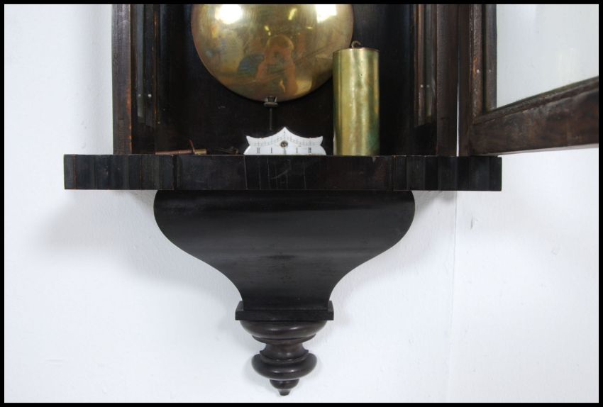 An early 20th century large ebonised mahogany vienna regulator wall clock having enamel dial with roman numeral chapter ring complete with pendulum and weight. Measures 116cm high x 37cm wide x 14cm deep.