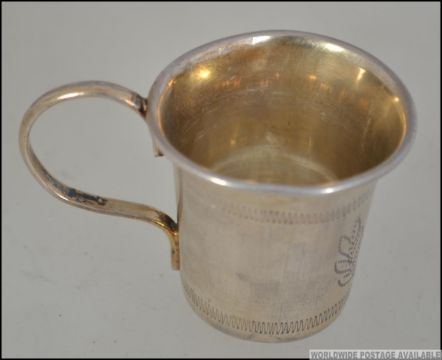 A silver hallmarked wine tasting vessel - miniature tankard of Yiddish - Jewish origin having star of david chased to the side. Hallmarks for Manoah Rhodes & Sons Ltd, London 1907. Weight 19.5g. Measures 4cm high.
