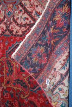 A 20th century handwoven large Persian rug of reduced size with red ground having black medallion with decorative spandrels and details elsewhere. measures 270cms x 140cms