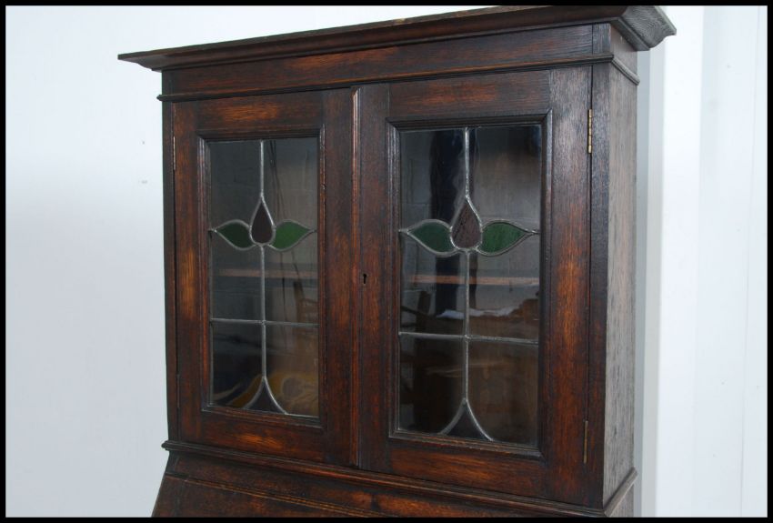 A late 19th / early 20th Century Arts & Crafts oak students bureau bookcase with with two Art Nouveau stained glass lead glazed doors, above a fall front opening to reveal a fully appointed interior above open shelves beneath. Measures 166cm high x 79cm wide x 23cm deep.