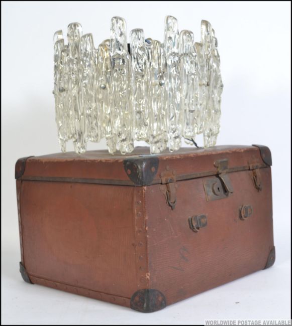 A retro 1960's faux glass resin set chandelier together with a vintage leather hat box bearing travel labels Measures 40cms wide
