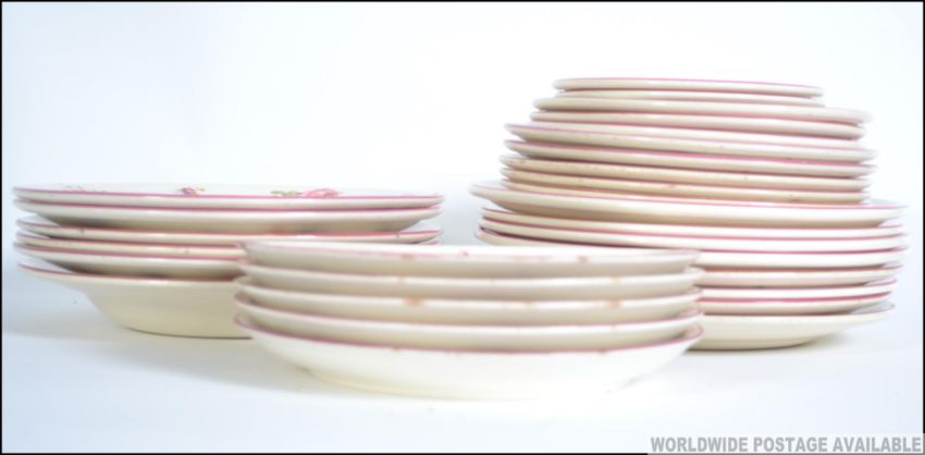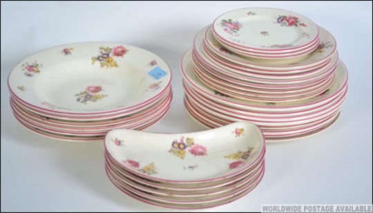 A mid 20th century chintzy decorated Royal Cauldon part dinner service of 29 pieces. Having transfer printed floral designs and pink border consisting of various sized plates, bowls etc